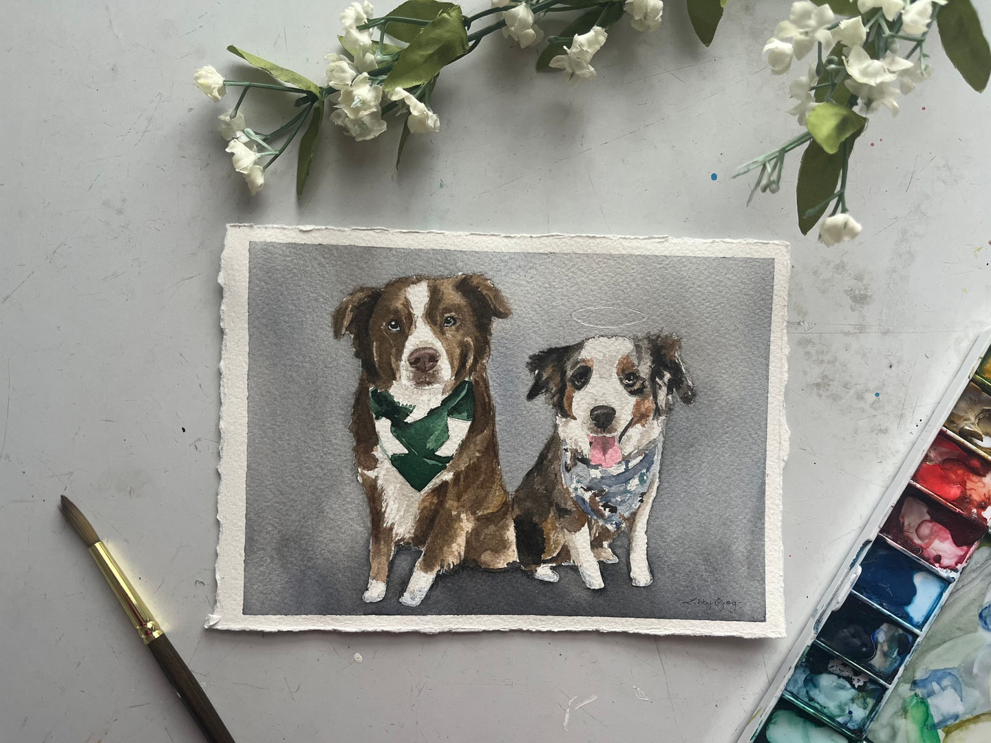Custom pet portraits hand-painted in watercolor capture memories in a timeless way! These portraits are painted in a highly realistic style and can be made in different sizes.